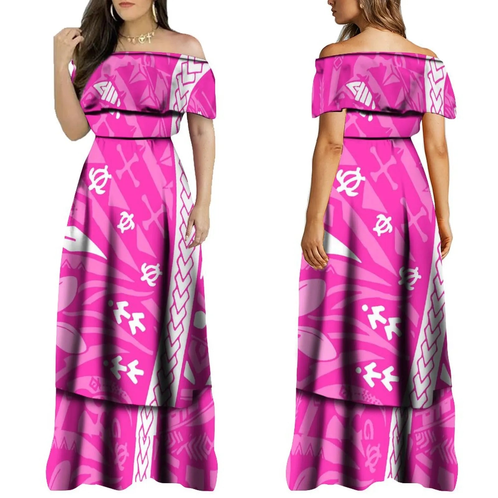 The Sofia off-the-shoulder dress features an elegant Polynesian print that celebrates island heritage with contemporary style. Designed to highlight the neckline and shoulders, this dress offers a flattering silhouette perfect for both casual and festive occasions. Crafted with breathable fabric, it ensures comfort while showcasing vibrant cultural patterns for a distinctive, refined look.