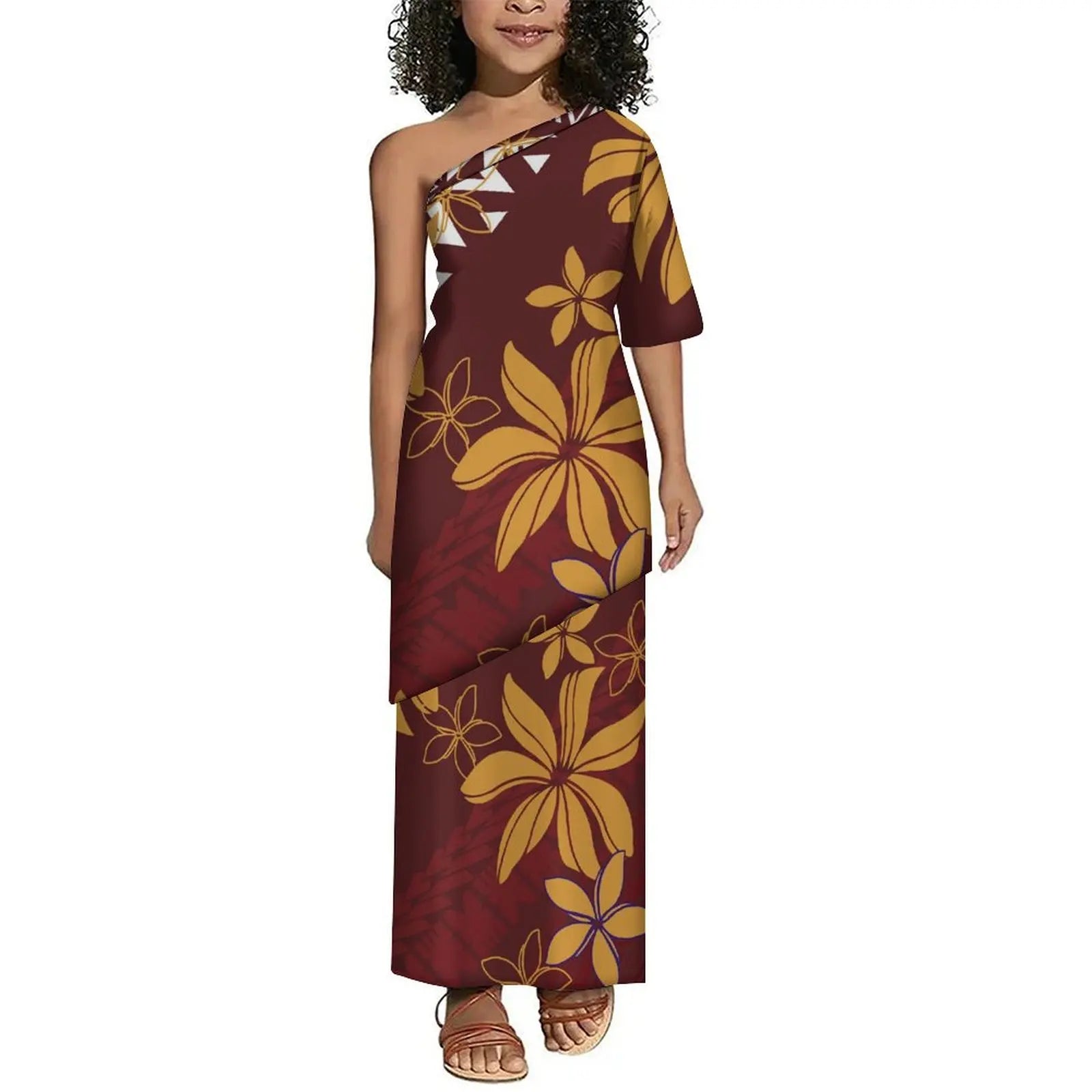This elegant one-shoulder "Alisi" dress showcases the traditional Polynesian Pule Tasi design, tailored specifically for young girls. Crafted with attention to cultural detail, it offers a comfortable fit and a striking silhouette that honors island heritage while providing ease of movement. Perfect for special occasions or cultural celebrations, this dress blends authentic style with youthful charm.